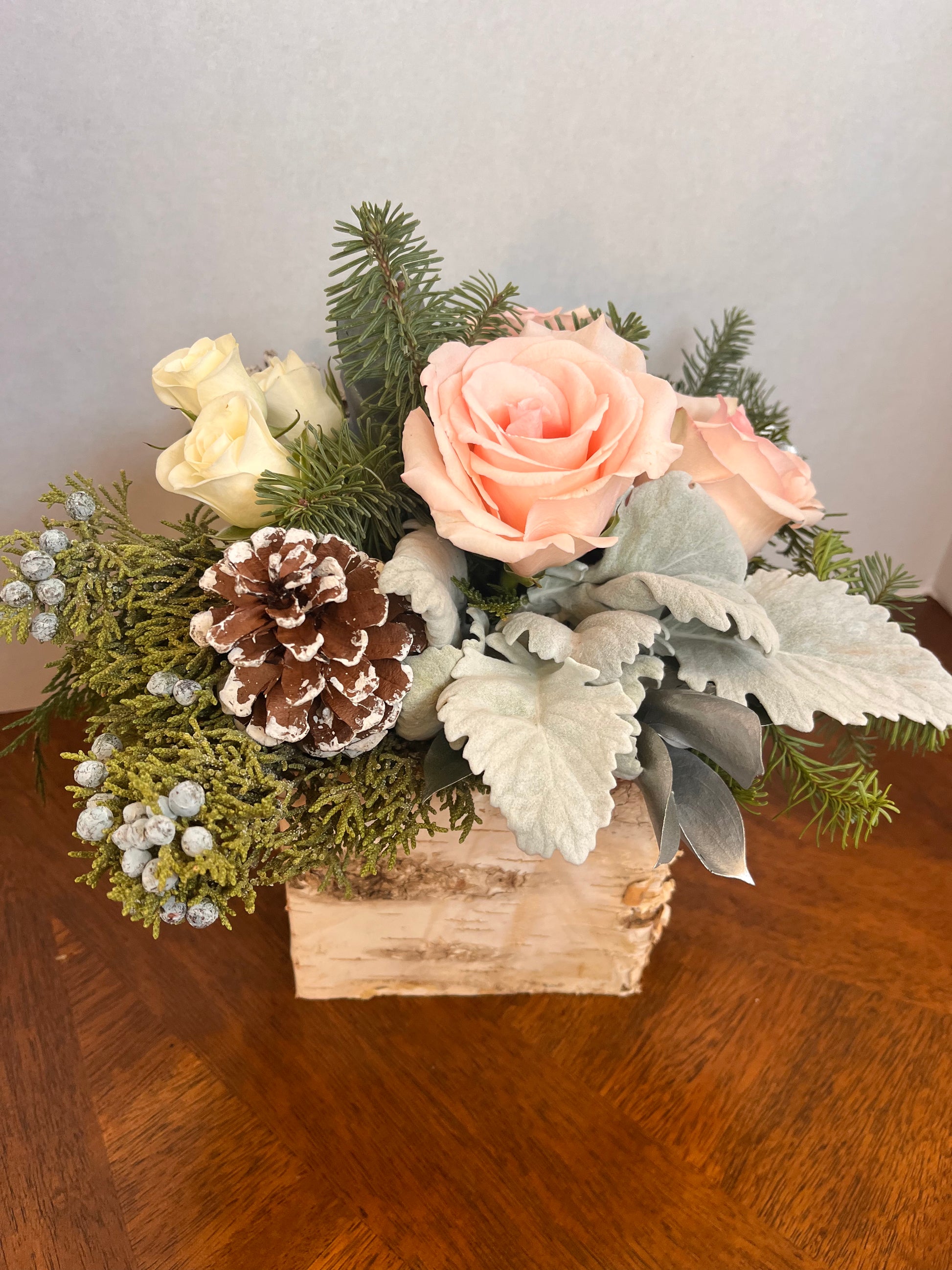A lovely flower arrangement in soft hues with light pink roses, white spray roses Christmas greens, dusty miller, snow pinecones neatly tucked in a square birch pot. Wether at home used as a Christmas centerpiece or in the workplace this is sure to welcome all to step into a winter wonderland!